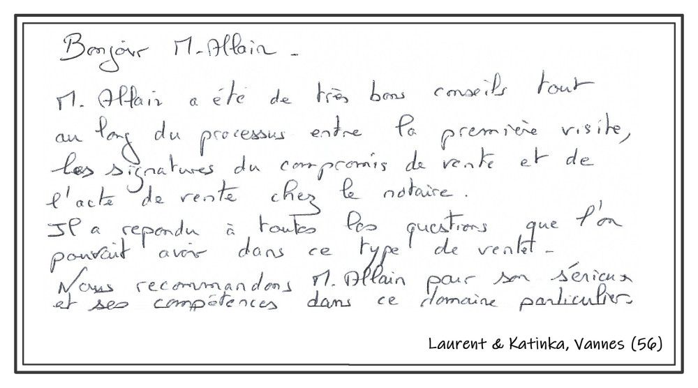 Nos clients vendeurs étant des personnes âgées utilisant peu voire pas Internet, et souvent ne maîtrisant pas la procédure pour poster un avis sur Internet, nous avons opté pour une page dédiée sur notre site présentant les avis de nos clients vendeurs ou acquéreurs. Vous pouvez prendre connaissance de ces avis ci-dessous. Pour chaque avis les prénoms des vendeurs ou acquéreurs sont notés ainsi que la ville. Tous ces avis sont 100 % réels et nous pouvons vous apporter plus de détails sur la vente correspondant à chaque avis sur simple demande, n’hésitez pas à nous contacter au 07.60.79.20.22.